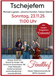 Wenn die drei kreativen und ambitionierten Musiker von Tschejefem in einem Matine um 11:00 Uhr ihre musikalischen Visionen, Ideen und Träume auf der Bühne realisieren, hauchen sie ihren Arrangements nicht nur Leben, sondern pure Lebensenergie ein. Mit ihrer Leichtigkeit und sprühenden Freude faszinieren sie ihr Publikum und nehmen es mit auf eine lebendige, facettenreiche und manchmal auch überraschende Klangreise, die durch verschiedene Genres und Nationen führt.